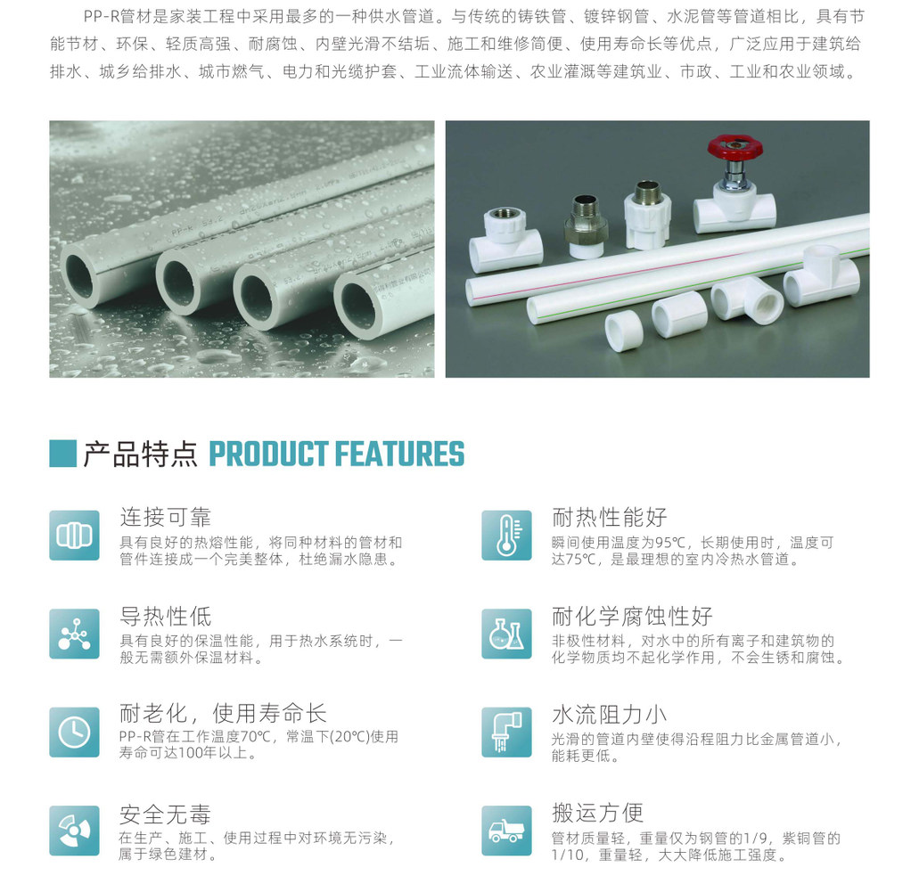 什么是四川PPR管材?讓我們一起來(lái)看看!一、PP-R管概念PP-R管又叫三型聚丙烯管,采用無(wú)規(guī)共聚聚丙烯經(jīng)擠出成為管材,注塑成為管件。是歐洲90年代初開發(fā)應(yīng)用的新型塑料管道產(chǎn)品。PP-R是80年代末,采用氣相共聚工藝使5%左右PE在PP的分子鏈中隨機(jī)地均勻聚合(無(wú)規(guī)共聚)而成為新一代管道材料。它具有較好的抗沖擊性能和長(zhǎng)期蠕變性能。二、PP-R管基本參數(shù)外文名:PP-R Tube全稱:三型聚丙烯管,無(wú)規(guī)共聚聚丙烯管品牌:都得利牌產(chǎn)地:四川廠家:都得利管業(yè)生產(chǎn)標(biāo)準(zhǔn):GB/T18742-2002工作溫度:70℃工作壓力:(P.N)1.OMPa使用壽命:可達(dá)50年以上導(dǎo)熱系數(shù):0.21w/mk用途:飲用水管;冷熱管顏色:白色、灰色生產(chǎn)工藝:無(wú)規(guī)共聚聚丙烯經(jīng)擠出成為管材,注塑成為管件性能:較好的抗沖擊性能和長(zhǎng)期蠕變性能連接方式:熱熔連接