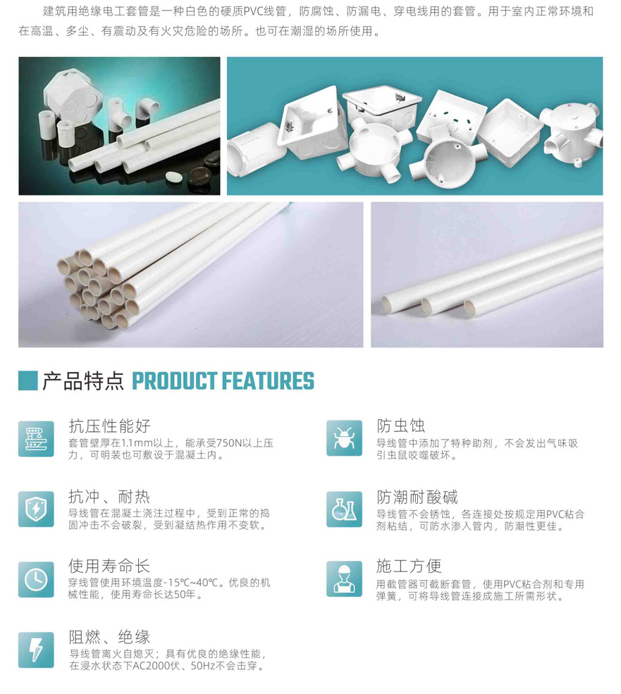 簡介—— 建筑用絕緣電工套管是一種白色的硬質(zhì)PVC線管,防腐蝕,防漏電,穿電線用的套管!